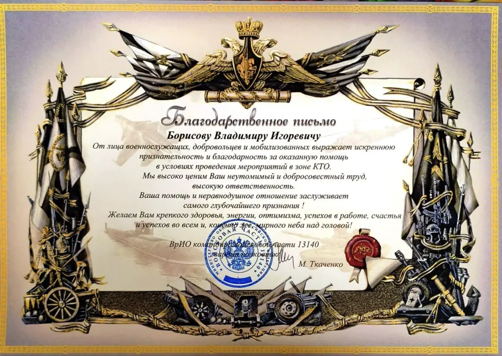 Командованием 5-й казачьей разведывательной штурмовой бригады «Терек» вручено благодарственное письмо члену Совета Автономной некоммерческой организации Центр научно-технических исследований «Комплексные системы безопасности» за долгосрочное оказание гуманитарной помощи личному составы выполняющие боевые задачи в зоне специальной военной операции. Вместе мы победим!