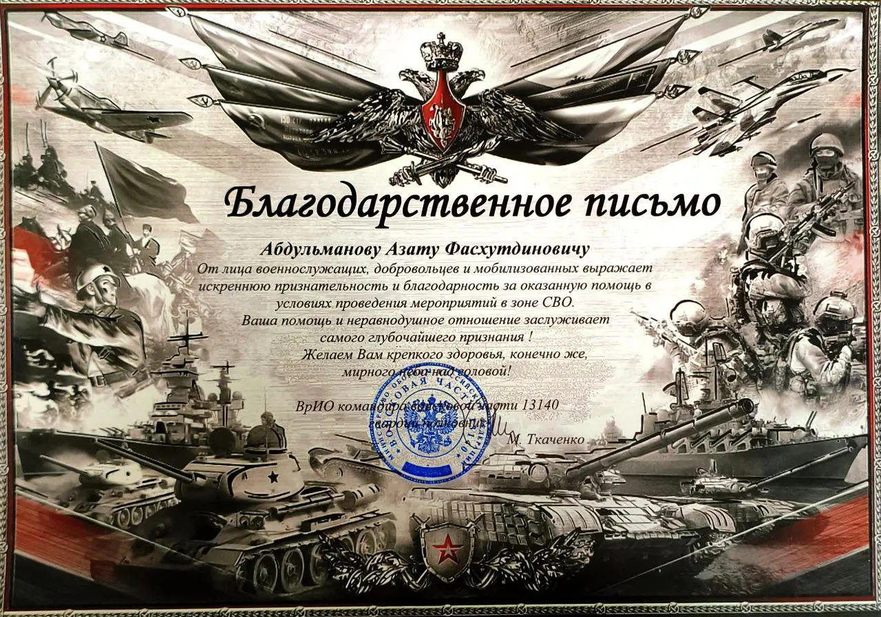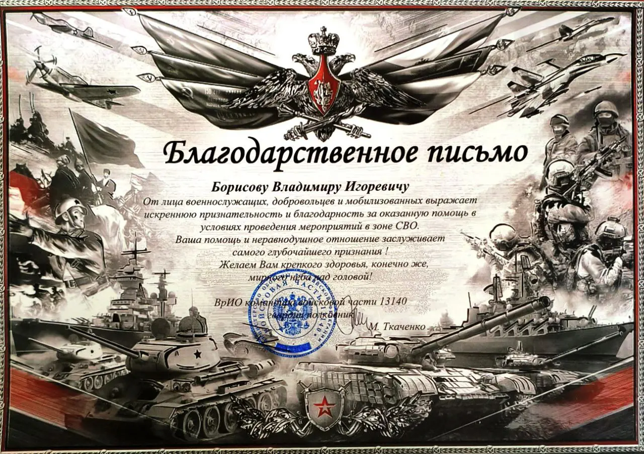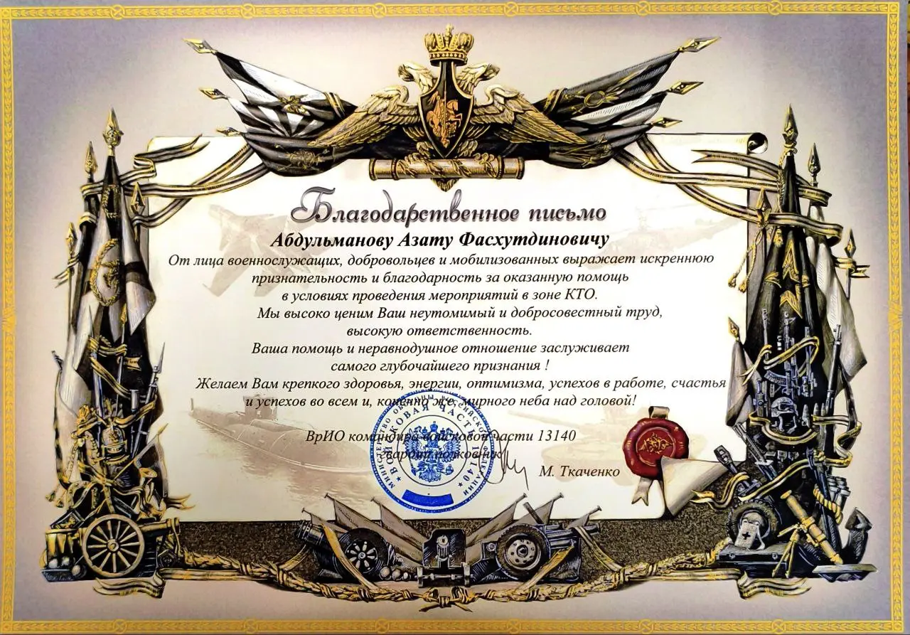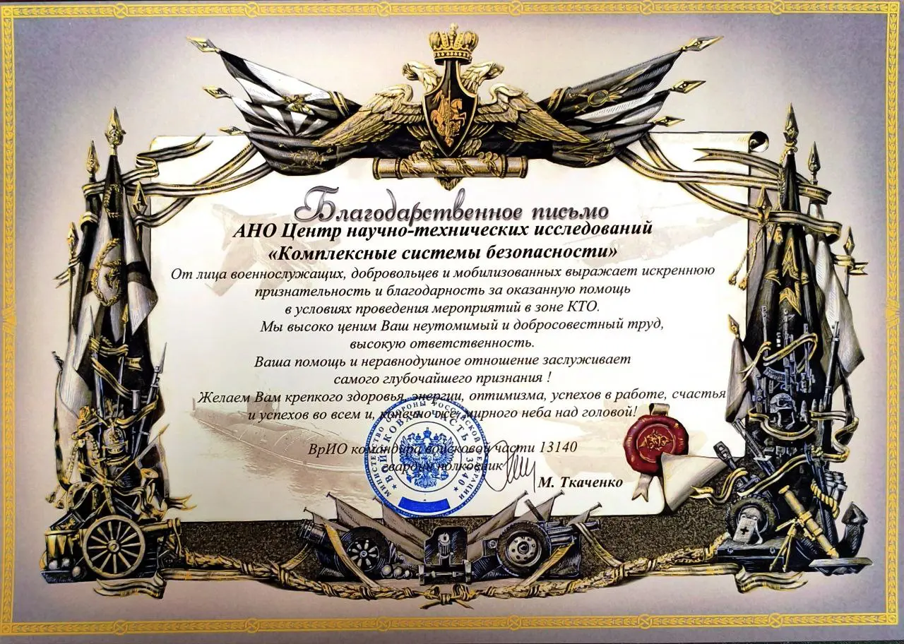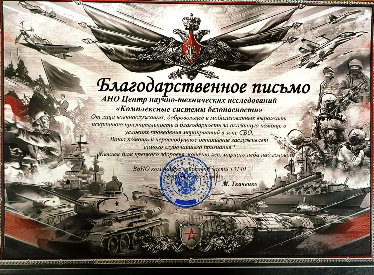 Командование в/ч 13140 вручило благодарственные письма АНО ЦНТИ «Комплексные системы безопасности» за долгосрочную поддержку и помощь участникам СВО